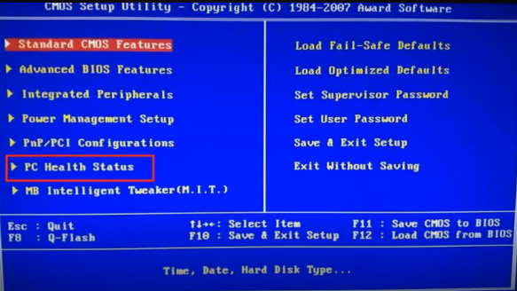 7、要是主板设置BIOS设置不当,进入BIOS界面中将pc health项目中的shutdoewn temperature值恰当调高。