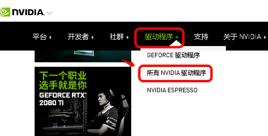 1、进入nvidia官网,点击驱动程序,出现下拉菜单选择所要nvidia驱动程序。