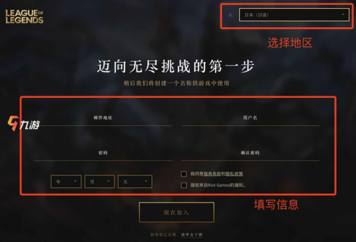 首先,我们需要去官网注册一个拳头账号,记得要先将地区切换为日本,然后就按照账号注册的一系列步骤,填写好邮箱、用户名、密码、出生年月等信息,提交完成注册就可以了。