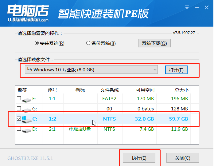 4.单击【打开】以查找先前放在U盘或计算机磁盘中的系统文件,然后选择【盘符】以表示要将系统安装到计算机上的C盘。选择后,单击【执行】。如果尚未准备好系统文件,则可以选择“系统下载”功能来下载所需的原始系统文件。
