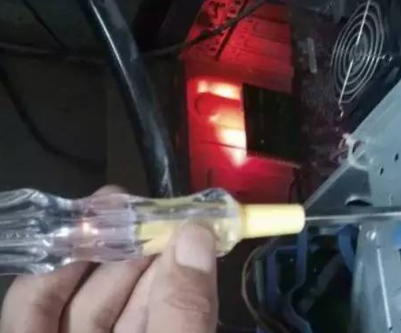 我们可以利用电笔去测试自己的机箱是否漏电,当电笔触碰机箱金属外壳时,电笔里的氖气管通红,则说明电脑机箱漏电。