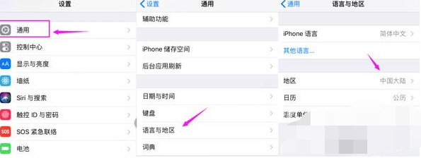 2.选择【语言与地区】,点击【地区】进入修改手机当前地区