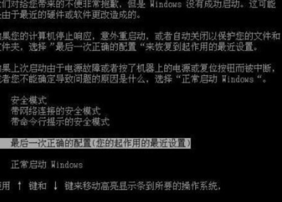 1.开机按F8进入笔记本的高级模式,如果能够进入我们选择最后一次正确的配置,然后点击确定。