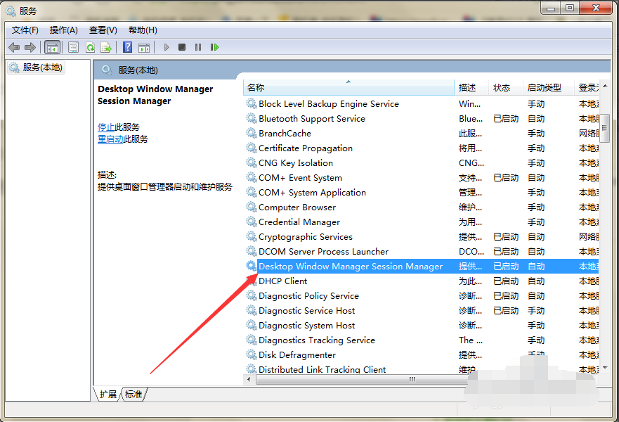 4、在右侧列表中找到“Desktop Window Manager Session Manager”服务。