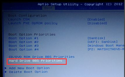 6、选择 Hard Drive BBS Priorities (硬盘驱动器启动优先级设置),按回车键;