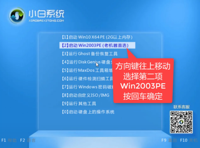 9、出现小白PE系统界面,我们选项第二项 启动win2003PE(老机器首先),如果进不去或者黑屏,请选择第二项;