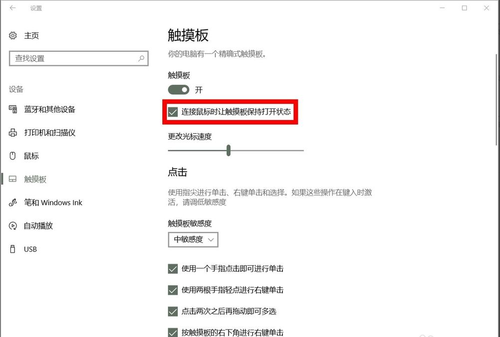 3、第2种情况:没有勾选"连接鼠标时让触摸板保持打开状态"选项。我们勾选该选项,即:鼠标连接时触摸板也可以同时使用。