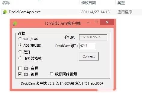 4、执行DroidCamApp.exe,选择--ADB(由USB)即可。