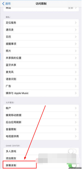 系统设置——【通用】——【访问权限】,在最下面的【屏幕录制】,看看是不是将其开启了。