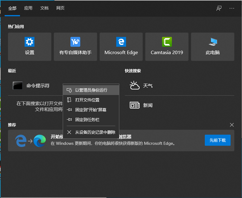 1、 在“ 开始”搜索框中键入命令提示符,右键单击最匹配的结果以管理员身份运行。