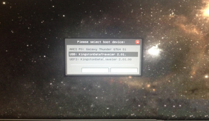 大家看下图,将光标移动选择到的地方显示“USB:KingstonDataTraveler 2.01.”(小编写这篇教程的时候使用的是金士顿u盘)所以,当我们按下快速热键F11的时候显示出来的选项中就包含有小编用制作好启动盘的u盘。