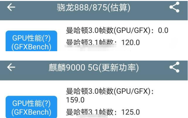 在GPU方面,骁龙888采用了Adreno 660,基于曼哈顿3.1,按照官方说法,较上一代提高35%,大概是(86~89)*1.35≈116~120,而麒麟9000,采用了Mail-G78,同样基于曼哈顿3.1,数值为125。