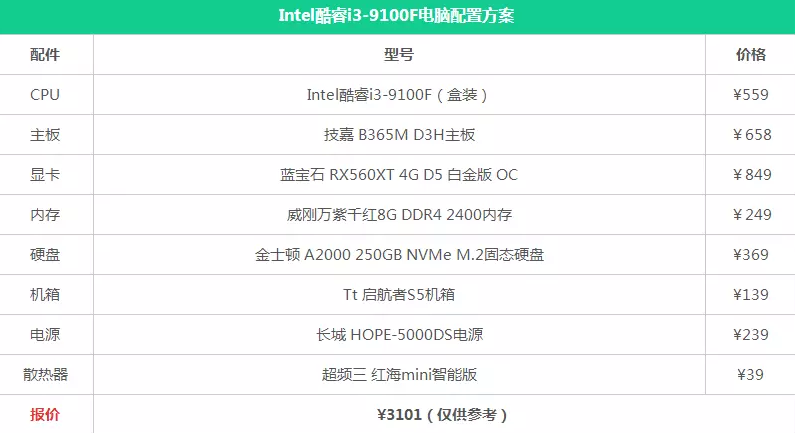 CPU 采用了英特尔的 i3 盒装,价格在 600 人民币左右,而主板通常采用了技嘉 B365M 主板,其实目前市面也可以考虑购买华硕的主板也不错。而在显卡方面我们可能要配置好一些的,一般要求显存高些,当然,您也可以购买英伟达的显卡。内存和硬盘方面提供的也均为性价比比较好的,完全够用。