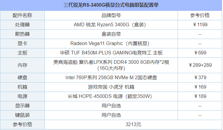 总的来说,三代锐龙R5-3400G相当于上一代R5-2400G升级版,在CPU性能和GPU核显性能有一定的提升,综合性能提升了10%不到。这套三代锐龙R5-3400G搭B450电脑主机清单预算三千出头,搭配了16G(8G*2)双通道大内存性能加持,并且配备了256G M.2 NVMe协议高性能高速固态,平时玩玩一般网游,例如LOL、DNF、CF、守望先锋等网络游戏,甚至低画质畅玩吃鸡、GTA5之类的主流游戏大作。这套APU平台配置适合对CPU性能要求较高,而对显卡性能不是太高的入门游戏玩家使用,CPU性能定位主流级,可以看做一款intel酷睿i5核显加强版,当然配件也可以自行调整,可以适当降低预算。