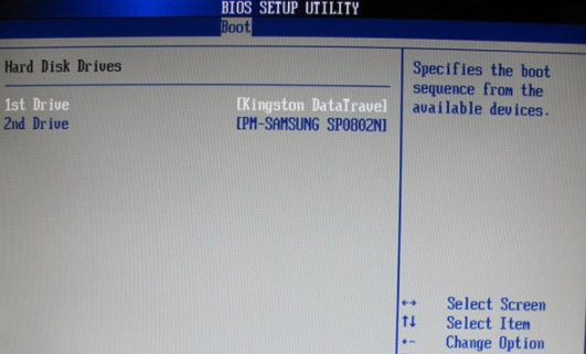 3、如果先在“Hard Disk Drives”里面选择U盘为第一启动设备,那么这里就会显示有U盘,那就选择U盘为第一启动设备。