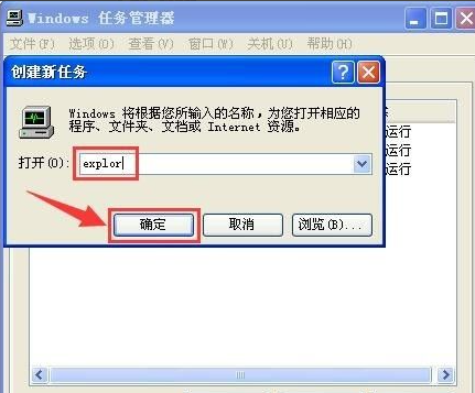 3、在出现的对话框中输入“explorer”,点击【确定】,稍等一下就会出现桌面图标了。