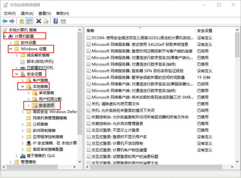 2、依次展开:计算机配置 → Windows设置 → 安全设置 → 本地策略 → 安全选项。