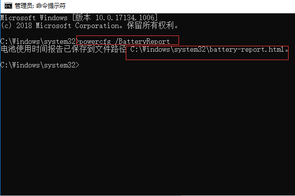 2、输入命令“powercfg /BatteryReport”,按回车键,会自动生成电池使用报告,并自动保存在“ C:\Windows\system32\battery-report.html”路径中。