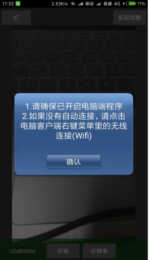 5、同时运行PC端,如下图,右击选择无线连接,输入验证码,即可完成链接。