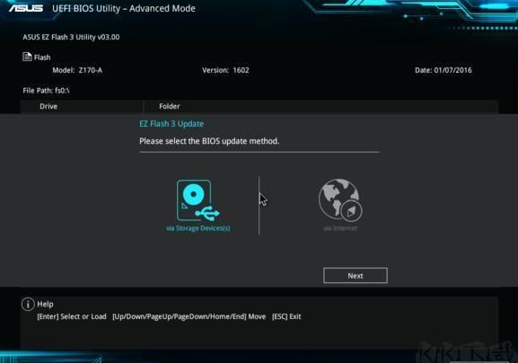 点击进去后,可以看到更新的两种模式,第一种是从Storage来进行更新,也就是从设备上更新;另一种方式是从Internet来更新,当然这个时候是需要您连接网络的,务必接上您的网线。这里需要特别说明,从Internet更新的话对于网络要求非常高,若是中途有中断的话就会导致BIOS读取、下载、更新的失败,且更新BIOS风险性极大,为保证主板顺利更新BIOS,建议使用在线的方法来更新BIOS。