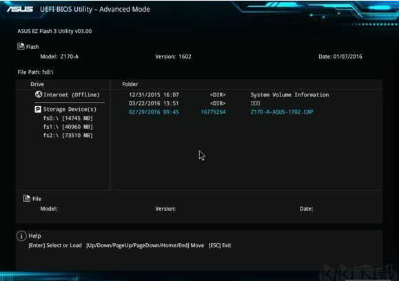 6、选择好了之后就可以看到更新BIOS的基本画面,在这里可以看到存放bios文件的U盘以及下载好的BIOS升级文件。