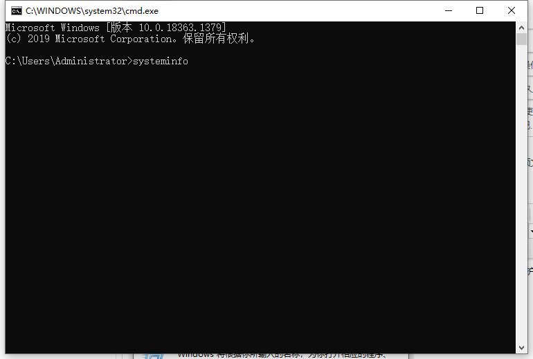 2、这时候会跳出一个对话框,在 C:\Users\Administrator> 后面输入“systeminfo”,然后按回车。