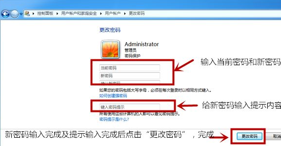 6、在打开的页面中输入“当前密码”和“新密码”,“确认新密码“,“键入密码提示”,最后点击“更改密码”,电脑重新启动后新密码生效。