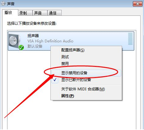 4、此时若没有查看到耳机设备的,选择扬声器单机鼠标右键,点击显示禁用的设备。