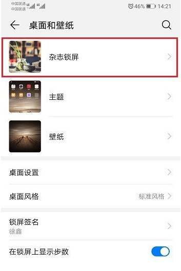 3、面和壁纸界面,点击杂志锁屏;