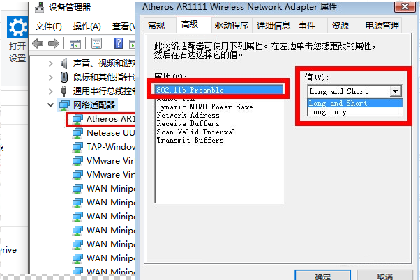 4、在“高级”选项卡的页面中,接着用鼠标左键点击“802.11b.Preamble”,再将后方的“值”更改为“long and short”就好了。