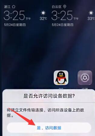 1、开启电脑,用USB数据线连接手机和电脑,然后手机会出现提示是否连接数据,选择是选项。