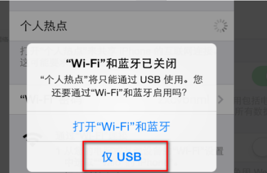 2、进入设置——个人热点——打开“个人热点”弹出对话框,选择“仅USB”。
