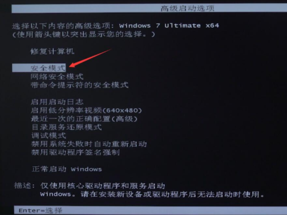 1、首先将电脑关机后重新开机,在开机时候不断按F8进入,选择安全模式,回车进入。