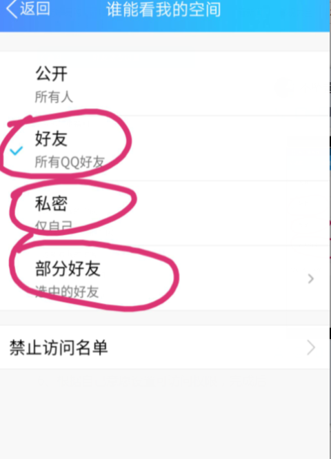 最后根据自己意愿设置可访问权限,比如你不想让部分好友进你空间,就点击所属分类里,把它选上就可以了,完成后点击”返回“。这样部分好友里的人就进入不了你的QQ空间,被限制了。