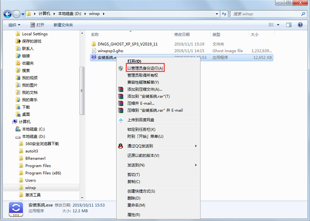 将下载的ISO系统镜像文件解压到除系统盘(默认C盘)外的其他盘根目录,右键以管理员身份运行“安装系统.EXE”。