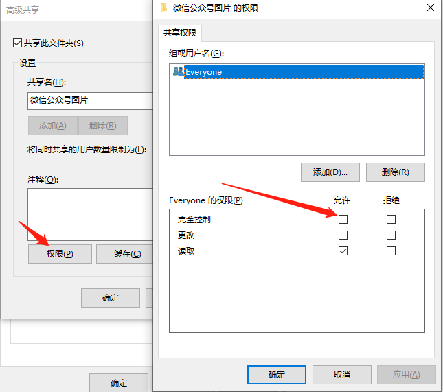 5、点击“权限”。勾选“完全控制”,然后将以上的设置通过点击“确定”全部保存。