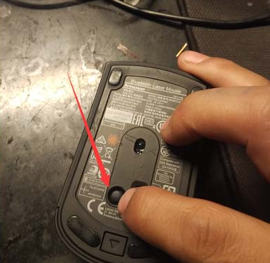 2、用手按下鼠标下部的小黑圆点,当鼠标的电源灯闪烁的时候松开按钮,鼠标进入配对模式。