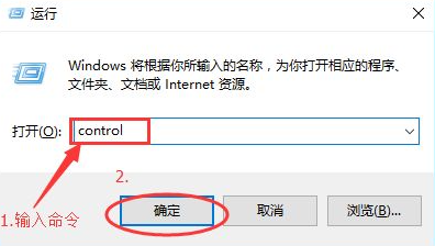 接着在窗口输入栏输入“control”(控制面板)命令,点击确定,即可快速打开控制面板。