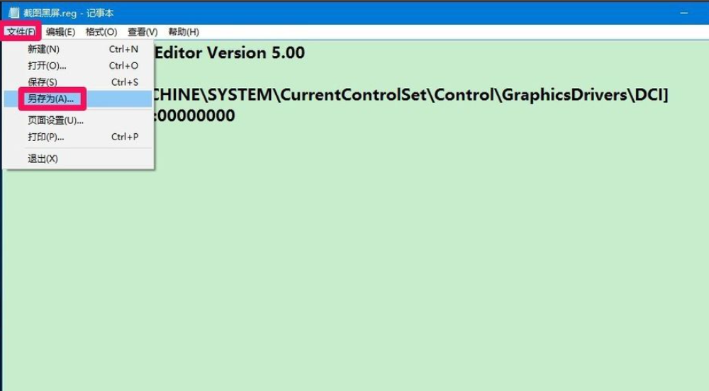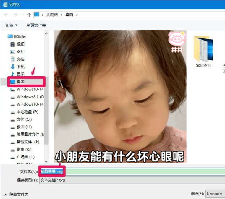 3、在另存为窗口,点击【桌面】,在文件名(N)栏中输入:截图黑屏.reg,再点击:保存;