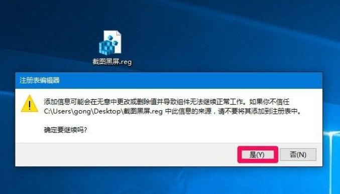4、我们点击保存以后,在系统桌面上会显示一个【截图黑屏.reg】注册表文件图标,左键双击截图黑屏.reg图标,弹出一个注册表编辑器提示对话框:然后点击是。
