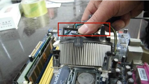 5、将CPU散热扇的电源线拔掉后,就可以用手抓住CPU散热扇的外包围握柄,同样使用向上提的方法,将CPU散热扇拿下来了。