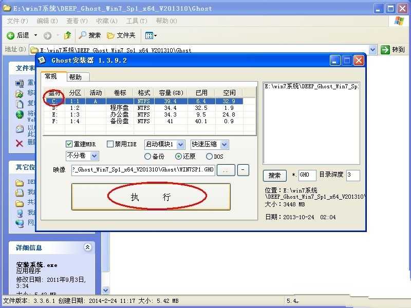 5、运行“安装系统”就会出现下面的界面,选择盘符C盘,一般就是默认就可以了,然后点“执行”