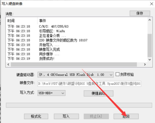 6、等待DOS系统写入完成后,点击返回关闭UltraISO软件。
