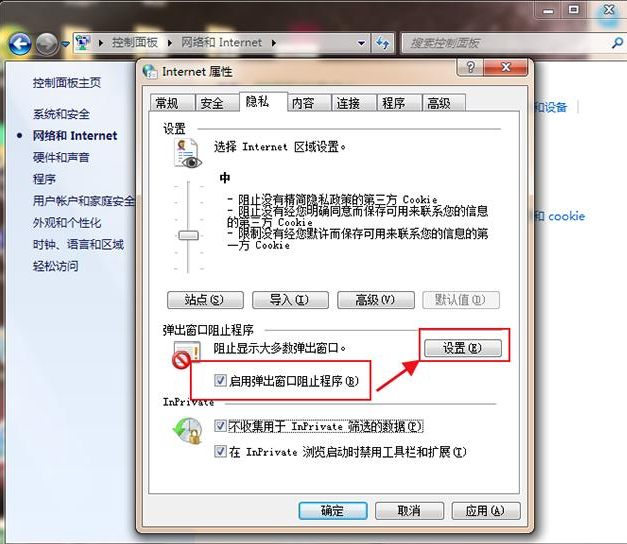 2、在Internet属性弹框内,点击【隐私】,勾选下面的【启用弹出窗口程序】,然后点击【设置】弹出阻止程序。