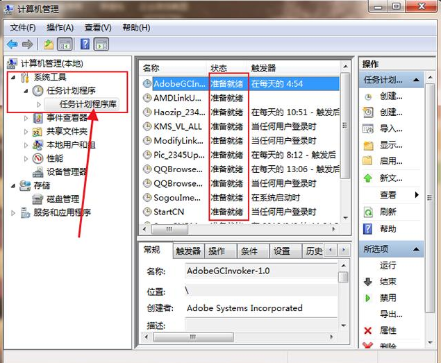 1、点击电脑桌面上的【计算机】,然后右键选择【管理】,就会弹出【计算机管理】的窗口,点击【系统工具】-【任务计划程序】-【任务计划程序库】弹出运行状态。