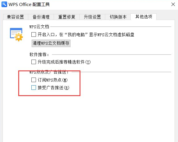4、点击选择页面顶部的其他选项,之后即可在这里设置WPS热点及广告推送的功能开关,最后点击确定即可。