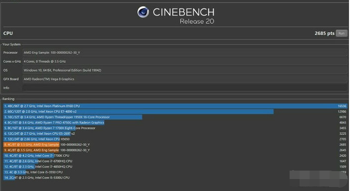 在流出的测试中,锐龙3 5300G的CPU-Z多核跑分突破3000分,单核则突破570分;Cinebench R20多核分数则为2685,相比上一代Zen 2微架构的4核心处理器锐龙3 4350G提升较为显著。