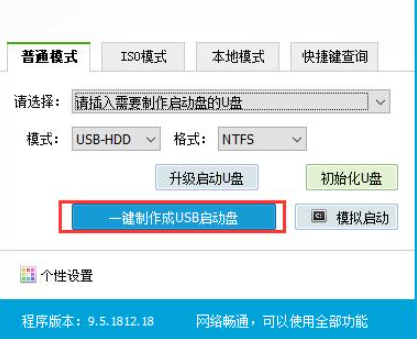 3、选择普通模式选项卡,“请选择”中选择自身U盘设备名称(一般会自动识别)。模式选择USB—HDD,格式选择“NTFS”。