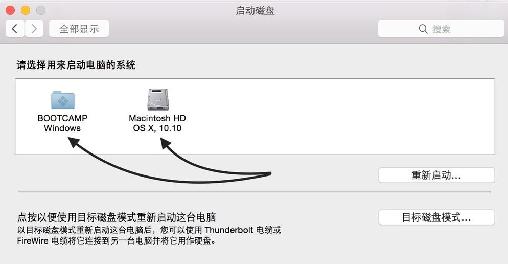 4、选择 BootCAMP Windows 这块磁盘,再点击“重新启动”按钮,即可让电脑以后一直进入 Windows 系统。