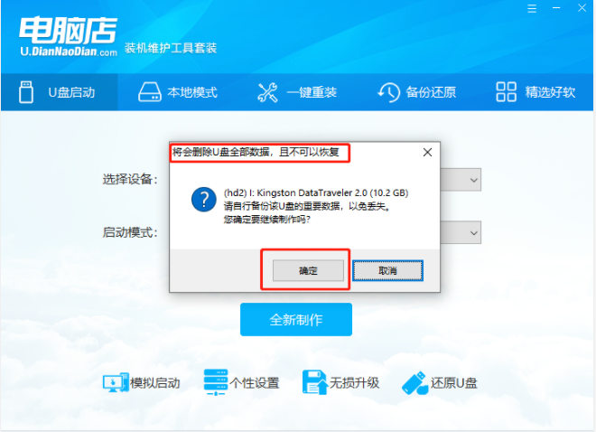 1、电脑插上U盘,打开“电脑店U盘启动盘制作工具”,(如没有特殊的制作要求,使用默认的模式与格式即可)点击“全新制作”。